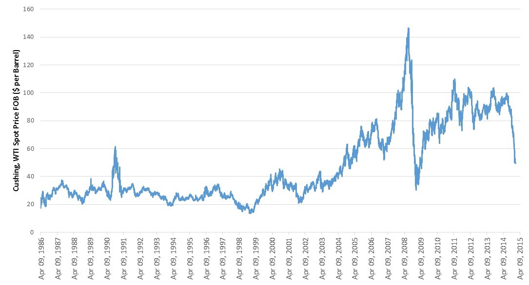 The spectacular collapse of oil prices in the past nine months has generated much buzz and fanfare (see chart below). Investors have piled on billions of dollars, betting a rebound of oil prices, which had been hovering around $100 per barrel for years. The action is emblematic of the famous mantra of “be greedy when others are scared, be scared when others are greedy,” and served many people well in seizing opportunities created by market chaos. However, people may have to bite the bullet if too many subscribe to this theory at the same time.